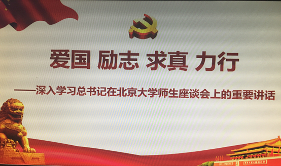 首先,由吕广南老师带领全体党员重温了入党誓词。接下来,支部书记赵阿华上了《爱国、励志、求真、力行——深入学习总书记在北京大学师生座谈会上的重要讲话》主题党课。今年是五四运动99周年,也是马克思诞辰200周年,在五四青年节来临之际,2018年5月2日,中共中央总书记、国家主席、中央军委主席习近平来到北京大学考察,同北京大学师生座谈并发表重要讲话。赵书记深入浅出地从爱国、励志、求真、力行为大家讲解了讲话精神的主要内容和学习体会。